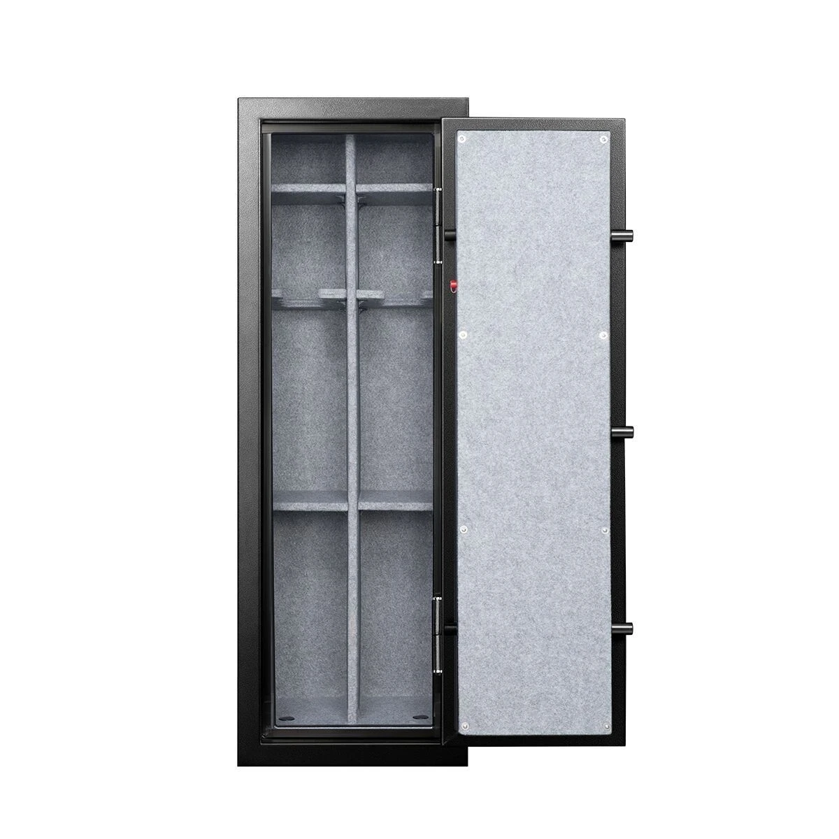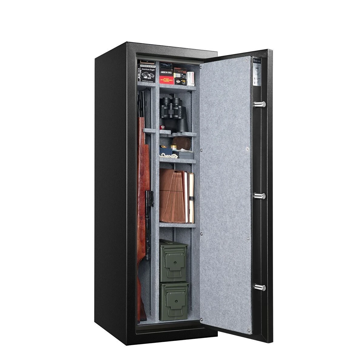 This Fortress 14 Gun Safe is built with you in mind and provides the best value in the market for a long gun fire safe. It has a fire rating of 1200 degrees Fahrenheit for 30 minutes. It features an electronic lock with Alarm U function. All Fortress Gun Safes offer extra protection with recessed doors and a patented notched bolt for increased pry resistance. No thief can walk away with your safe because it includes a heavy-duty bolt-down kit. With Fortress, you’re truly protected.