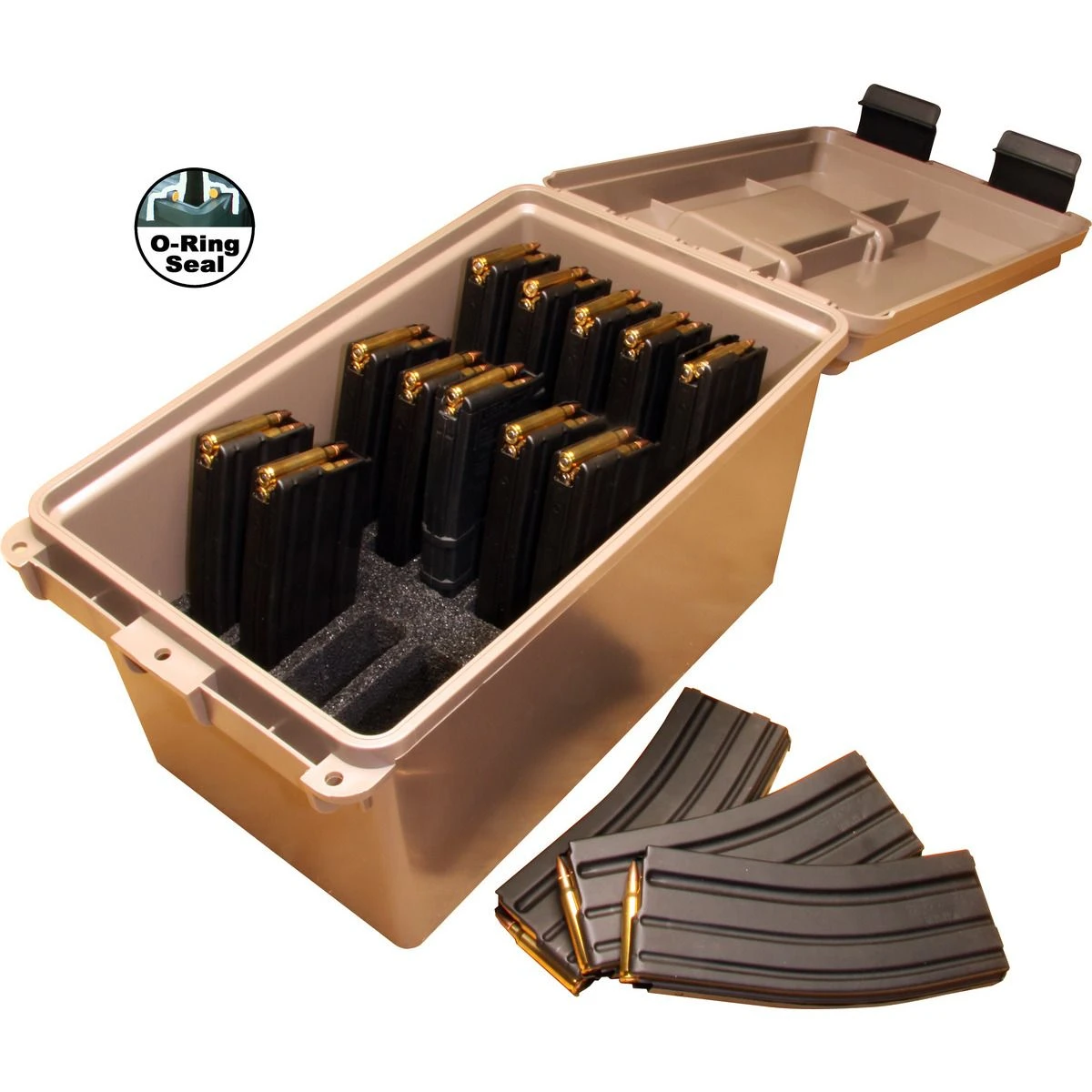Always ready for quick transport, Tactical Mag Cans offer a protected method of storage for loaded magazines. Each mag is individually secured with ridged precut foam padding to prevent bumping, sliding and scratching. All box shuts tight with an O-ring seal and solid latching system. Dual latches give better sealing and prevent accidental openings. Security tabbed for three padlocks. Molded-in stacking ridges for slip resistant stacking. Comfortable handle for when you’re bugging out. Tactical Gun owners can rest assured knowing their cache is protected inside MTM Mag Cans. Double latched for safety and has 3 padlock tabs.