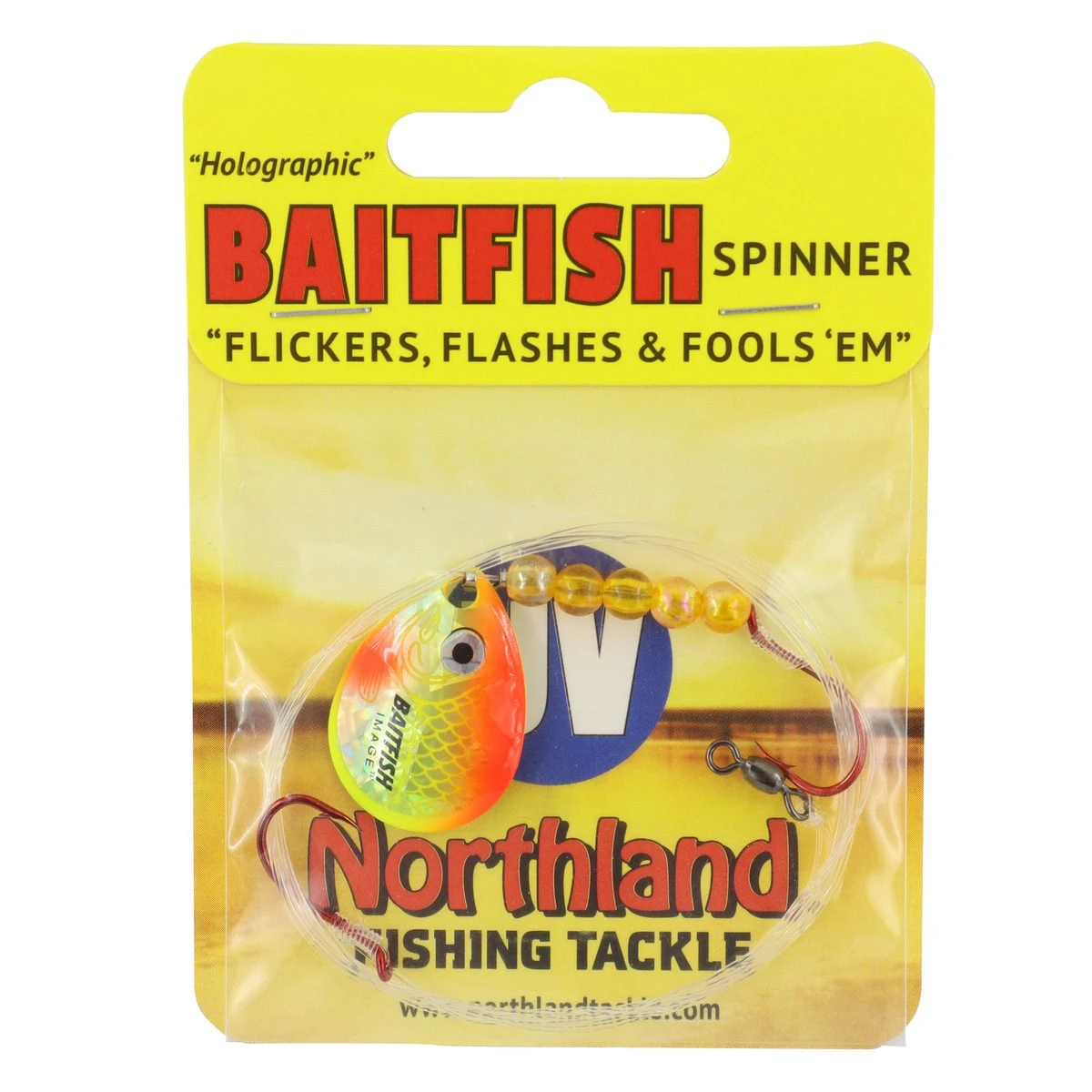 - Sunrise sports needle-point hooks, durable leader and holographic blades and beads.